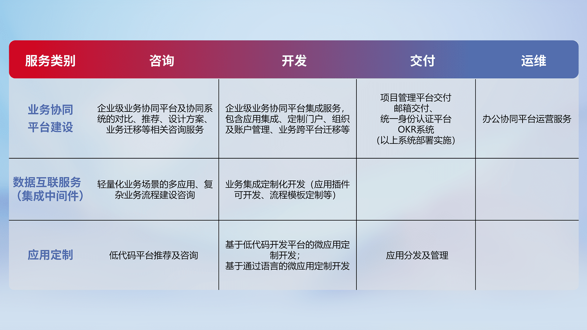 针对钉钉、、企微、、IDaas等平台级产品提供产品的规划、、、方案、、交付、、、定制化开发等服务,,,实现如统一协同办公、、、、智能客户服务、、混合会议管理、、、智能数据查询、、、等业务场景,,,实现数字化转型。。