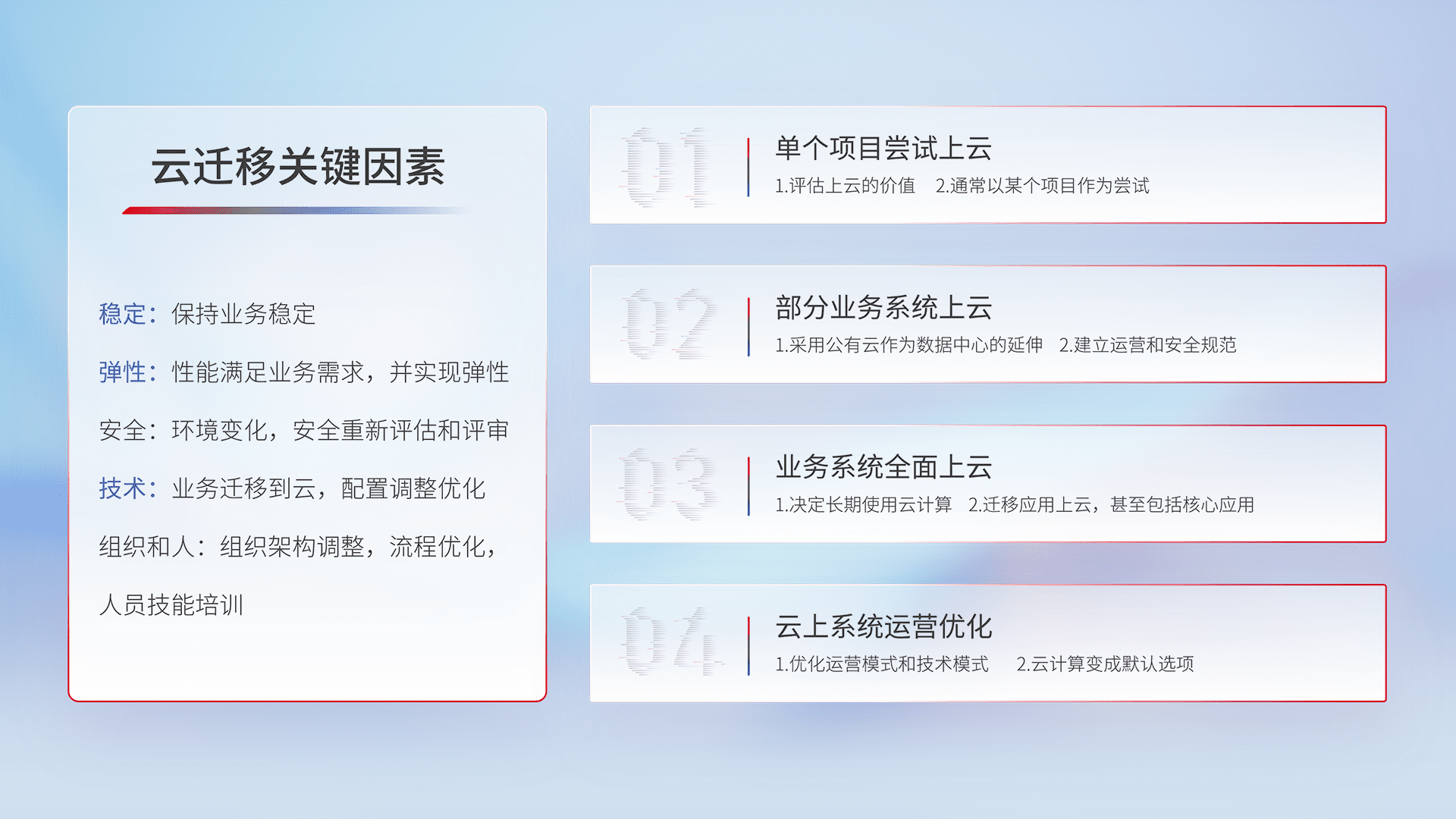 结合实际业务,,从规划设计、、云平台选型、、、、云原生改造、、、、数据迁移、、、集成交付,,,,迁移全过程为客户识别最佳上云路径,,,,做好风险识别管理,,设计网络架构、、、身份权限、、、安全审计合规、、、操作审计、、、、日志审计、、、、监控告警策略、、、、多站点容灾设计等,,,,对云上基础设施进行整体规划,,,,提升IT治理水平,,,,以满足弹性、、、、高可用、、、、高性能的需求。。