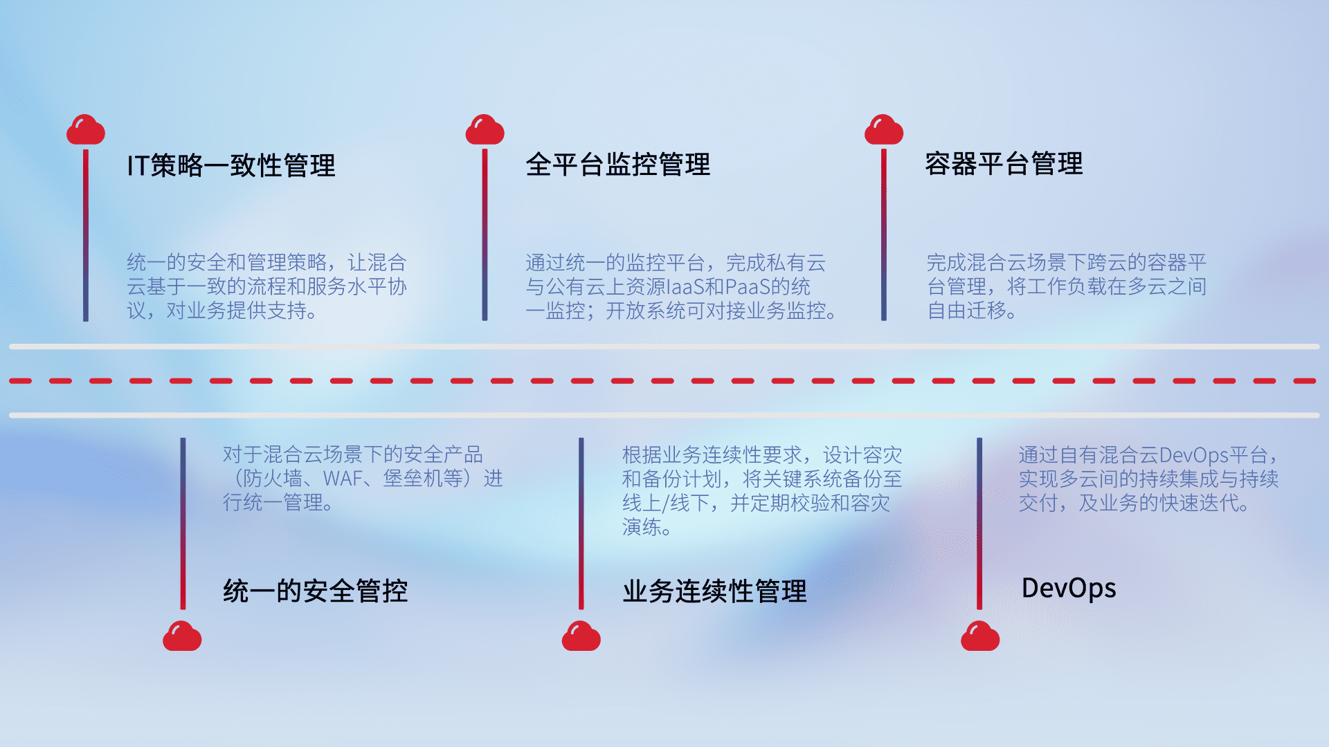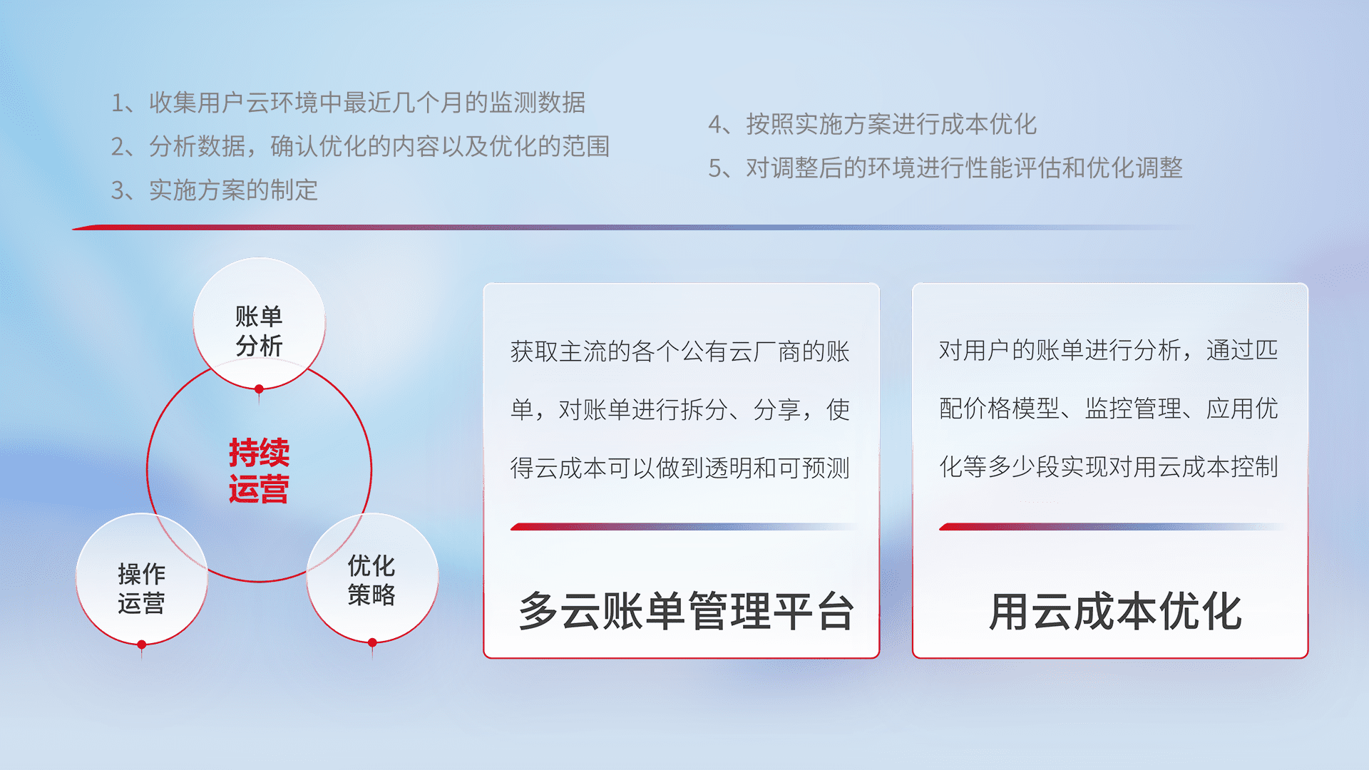 通过多云纳管,,,以统一的资源数据模型把客户的云资源进行抽象和封装,,,进而实现对多云资源的统一操作,,,保障云资源管理的可靠性、、、、稳定性与可用性。。。量身定制化运维内容,,配置、、开发运维、、补丁管理、、、备份、、监控、、认证和访问管理、、、、审计和日常巡检等,,,保障在用云过程中的可靠度,,,,稳定度以及高可用率。。。