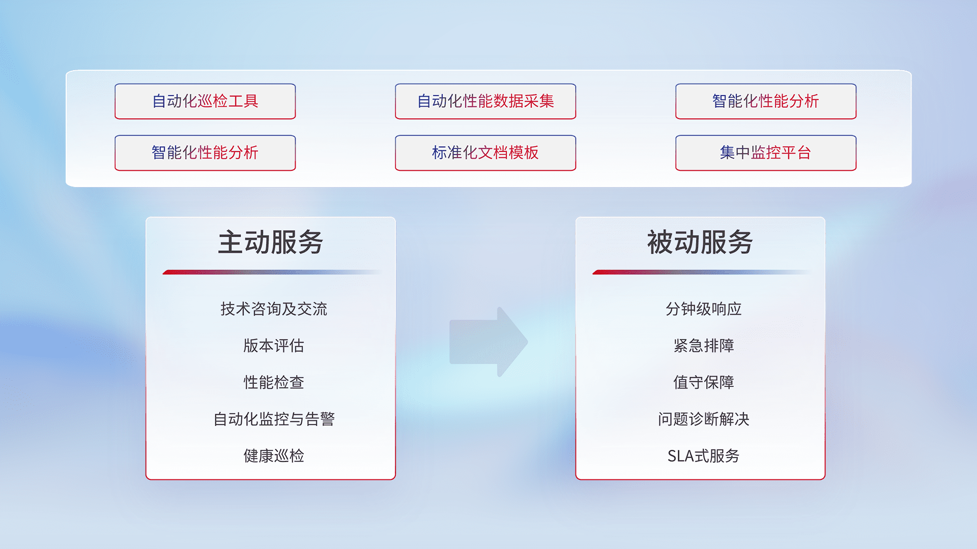 智能化工具和标准化文档,,保障服务质量,,,提供主动服务(包含技术咨询、、版本评估、、、、性能检查、、自动化监控与告警、、健康巡检)和被动服务包含(分钟级响应、、紧急排障、、值守保障、、、问题诊断解决、、SLA服务)。。。。