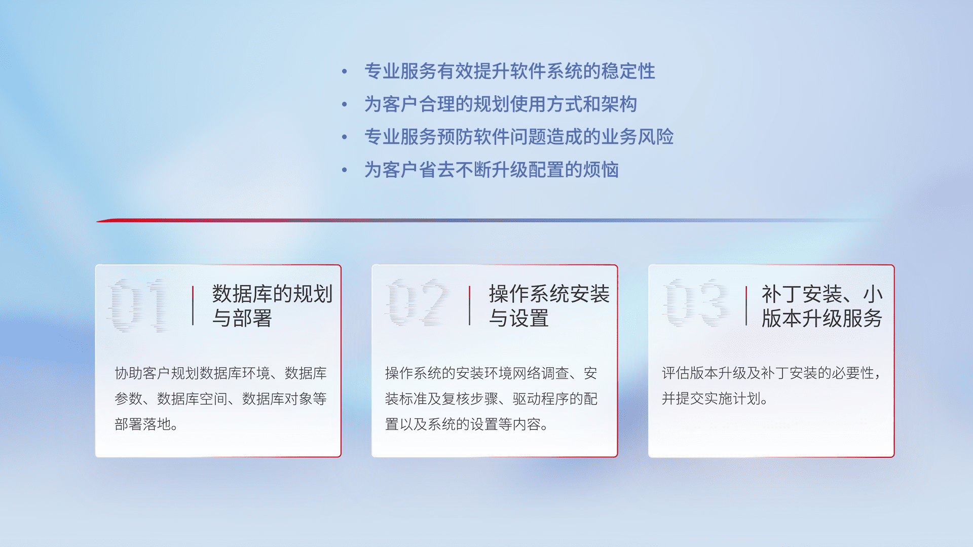 为客户提供软件规模升级、、、、快速部署、、、按需配置的专业服务,,,,从数据库的规划与部署到操作系统的安装与设置,,,再到补丁安装和小版本升级提供支持。。。。